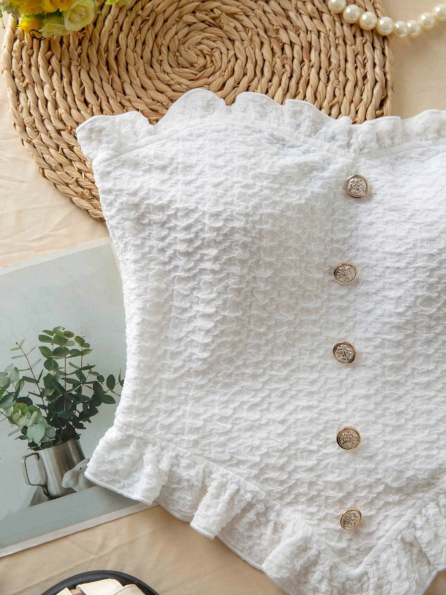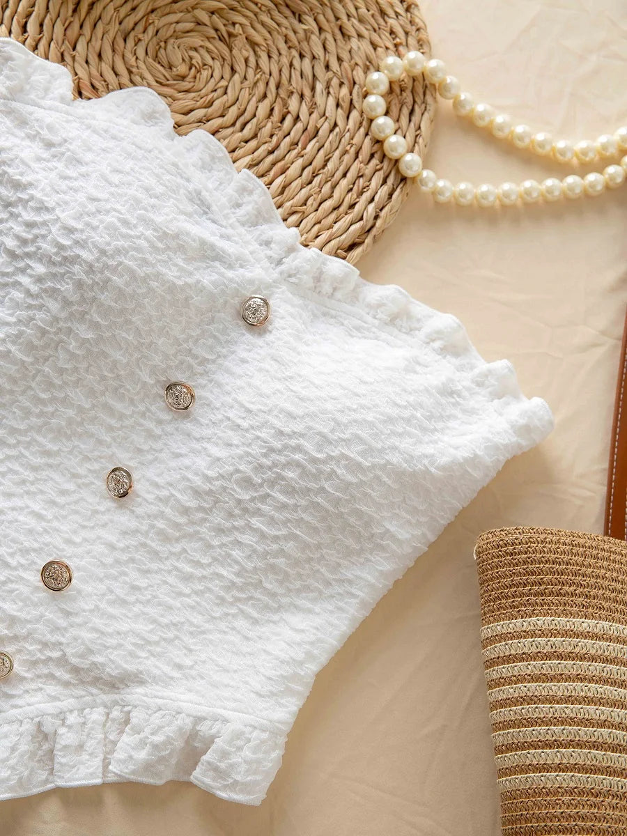 Playful and romantic, the Amaya Crop Top features a strapless ruffled neckline and button-front detail for an effortlessly feminine touch. Perfect for sunny days, beach outings, or summer festivals.