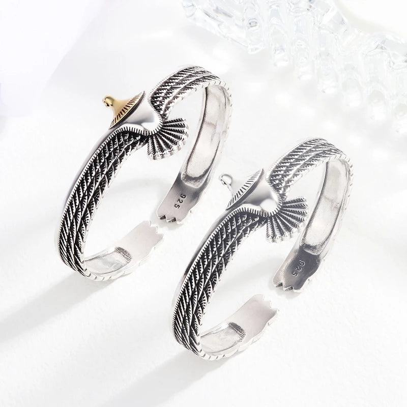 Inspired by strength and freedom, the Eira Bracelet showcases finely detailed eagle feathers crafted from genuine 925 sterling silver. Its adjustable open design and bold presence make it a standout unisex piece.